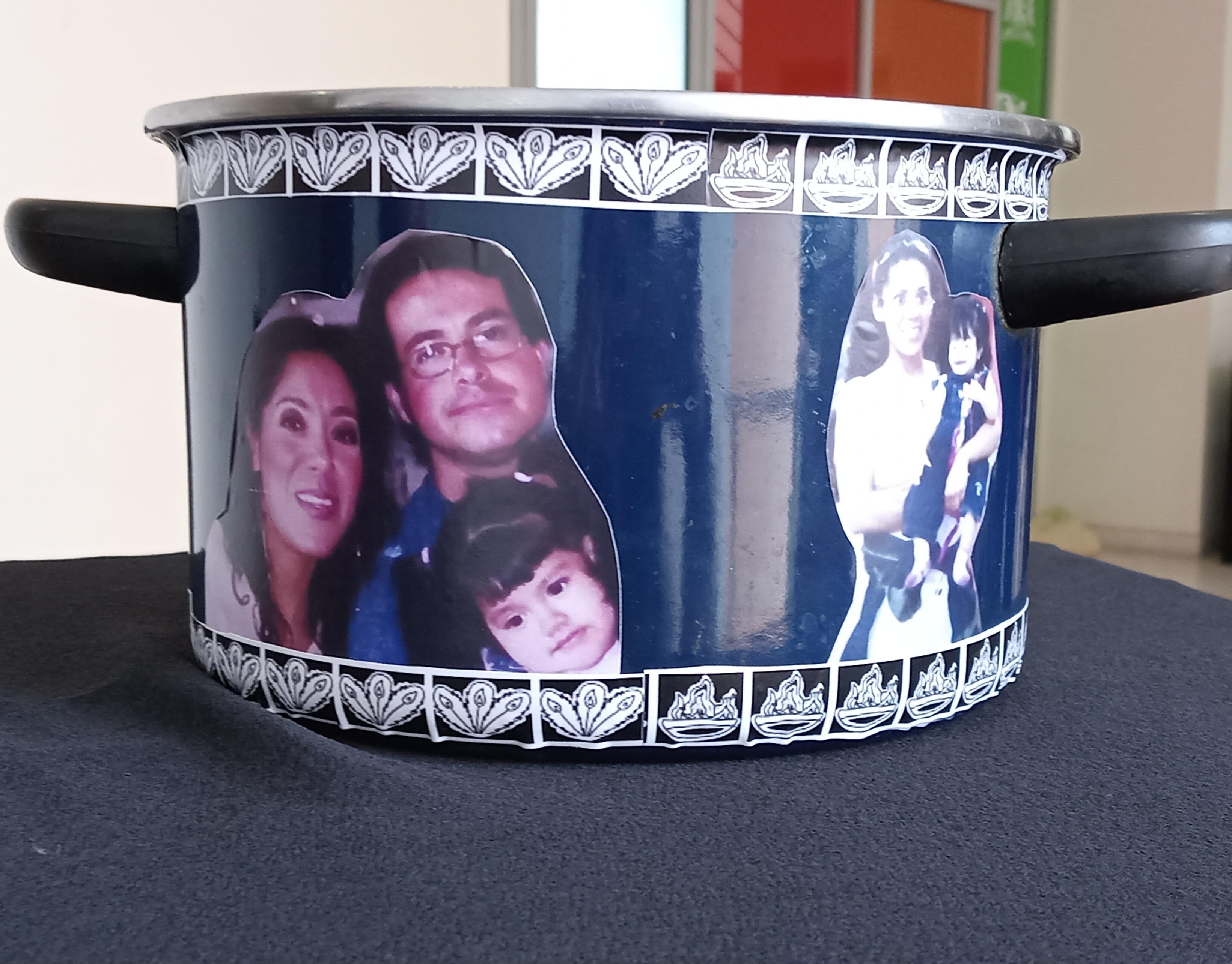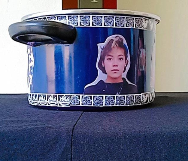 Se intervino una vieja olla de cocina utilizando fotografías en distintas etapas de la vida de mi mamá, pegadas en orden cronológico y usando símbolos para representar a una deidad en cada etapa realizando una analogía a cada una.