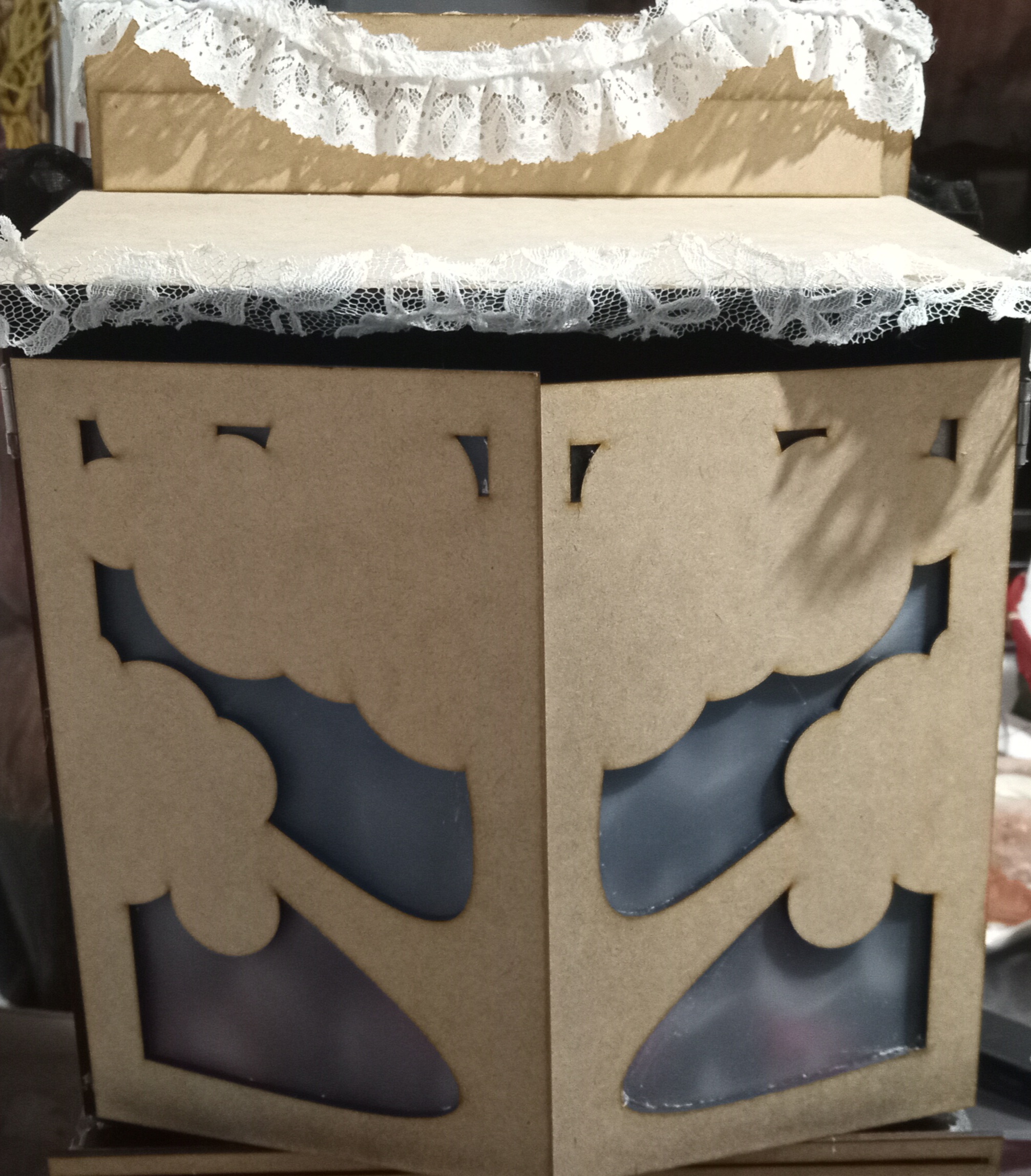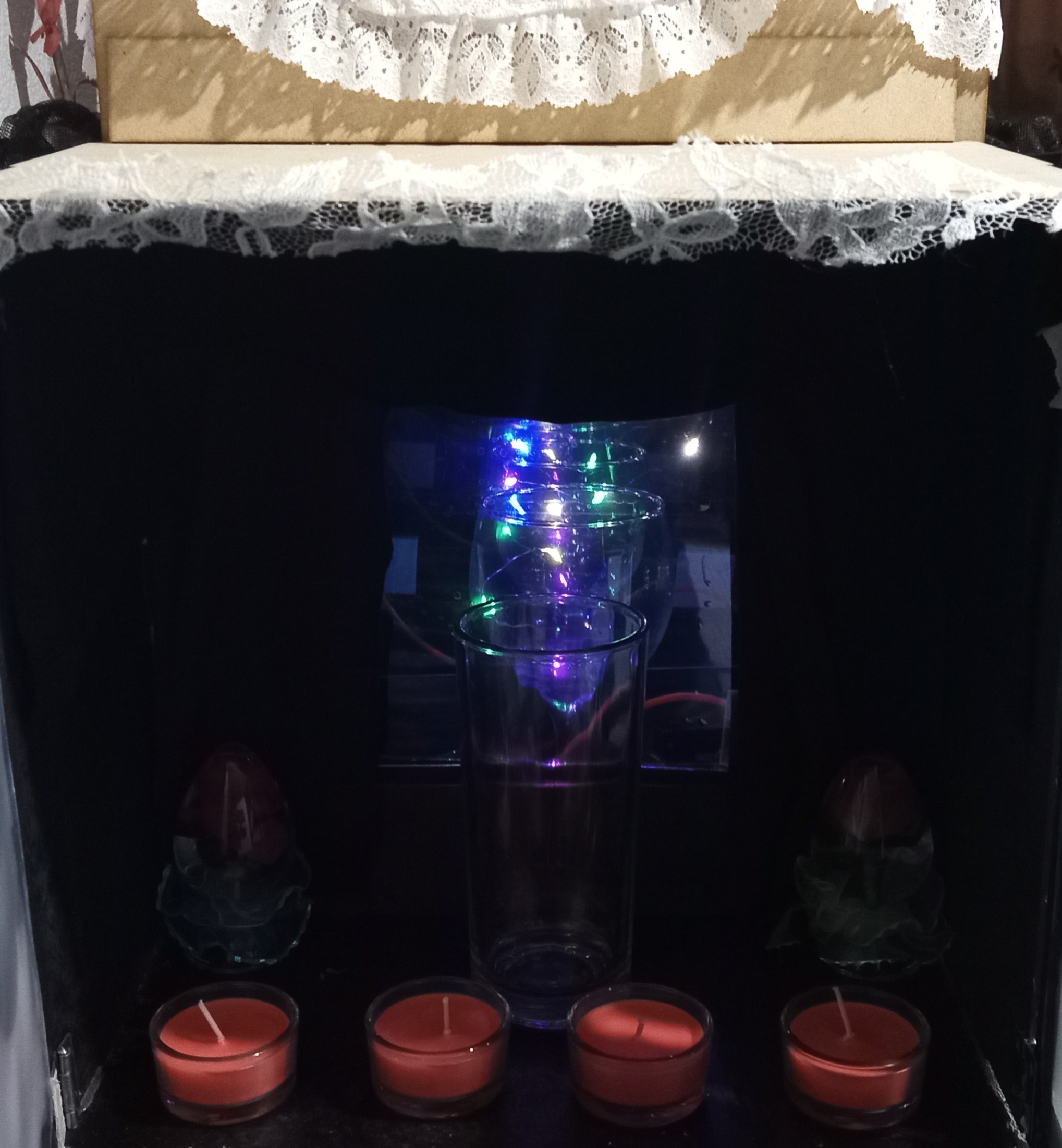 Conciste en un pequeño altar construido con MDF, con apariencia de armario, en cuyo interior se encuentra un espejo que refleja la conexión entre lo espiritual y lo material.