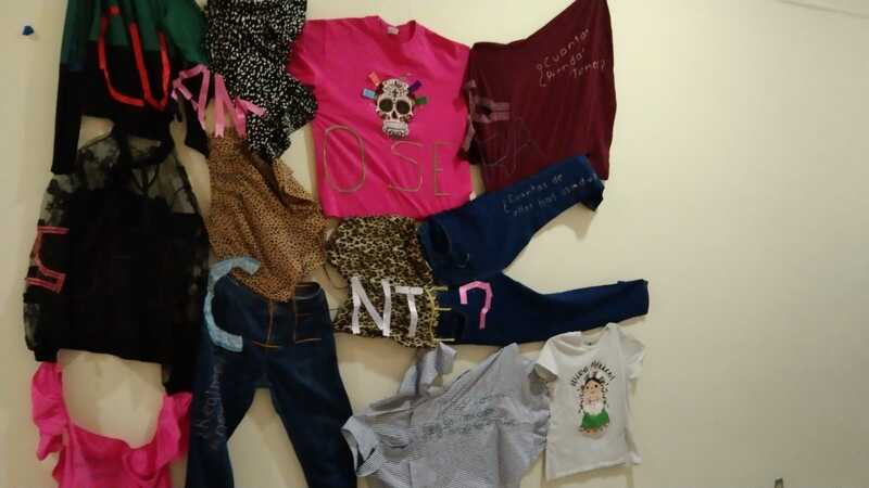 Puezas de ropa unidas una con otra a manera de manta, en cuyos retazos se encuentran cosidas preguntas cuyo fin es generar estas mismas preguntas en el espectador respetcto al consumismo masivo de ropa