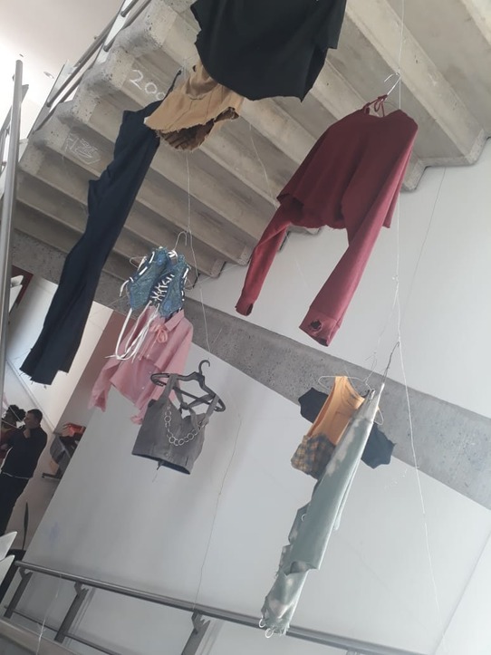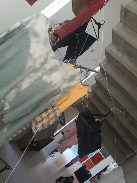 prendas intervenidas colgadas por alambres que rodean y se entrelazan con el espacio.