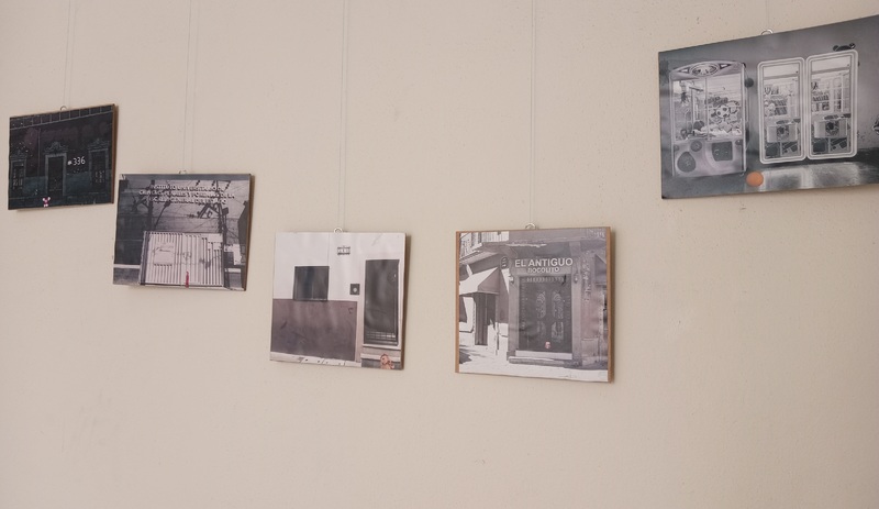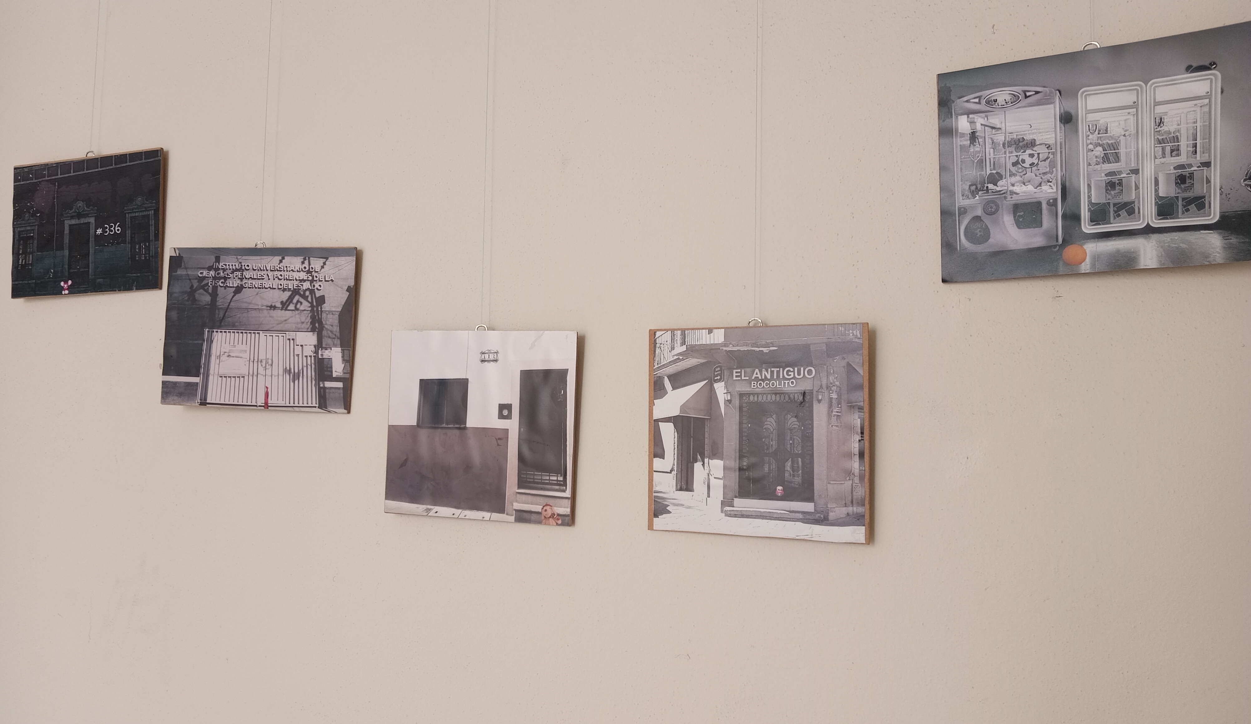 Serie de 5 fotografías en una base de MDF, de medidas variadas de 5 lugares, editadas con un filtro en blanco y negro, y superponiendo imágenes.
